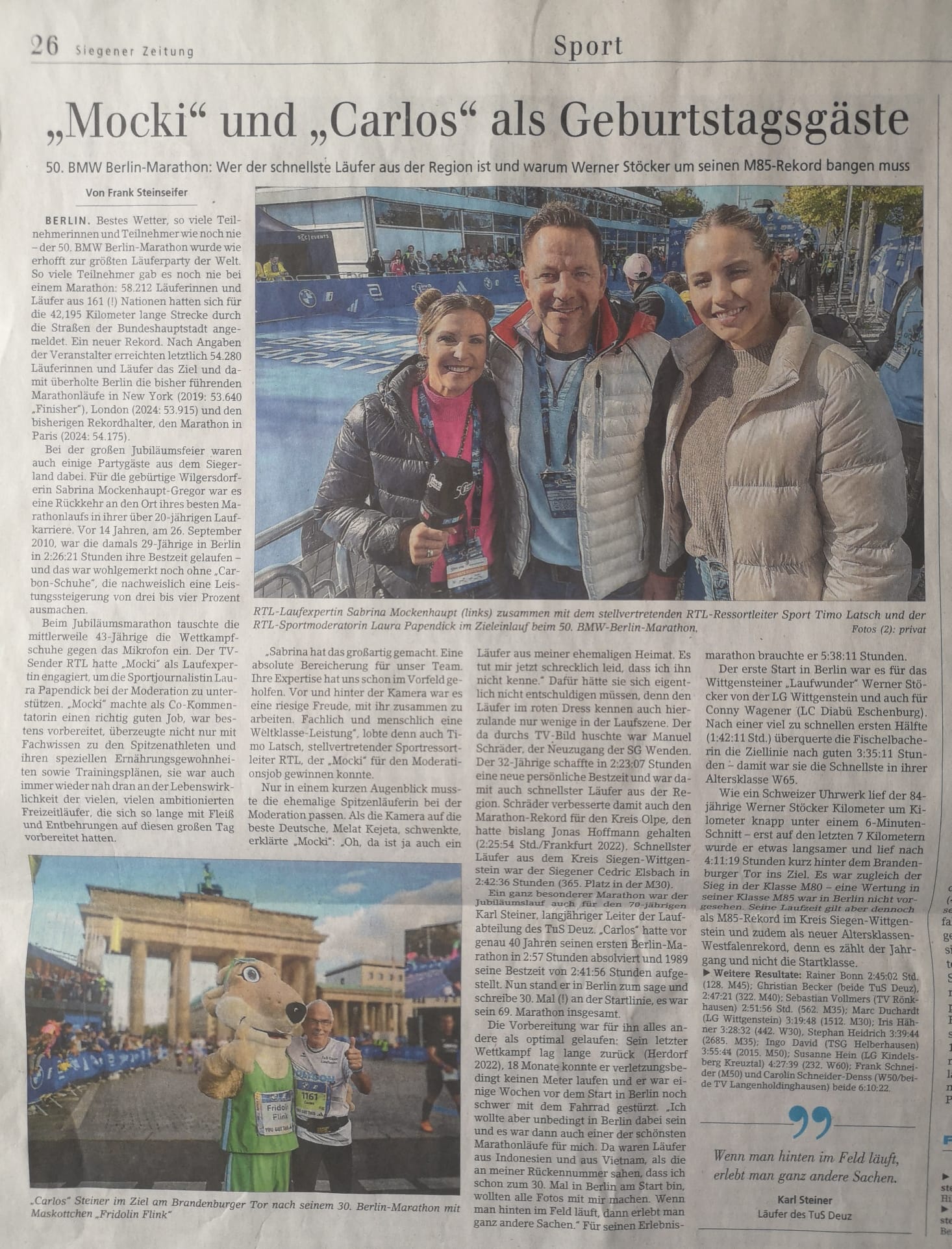 Der TuS Deuz war mit drei Aktiven vertreten, wobei Holger Natzke in seiner Altersklasse M65 mit guten 21:00min Platz 3 belegte. Der spurtstarke Michael Kämpfer (LG Kindelsberg) konnte sich in dergleichen Altersklasse am Ende in 20:55min noch Platz 2 sichern.